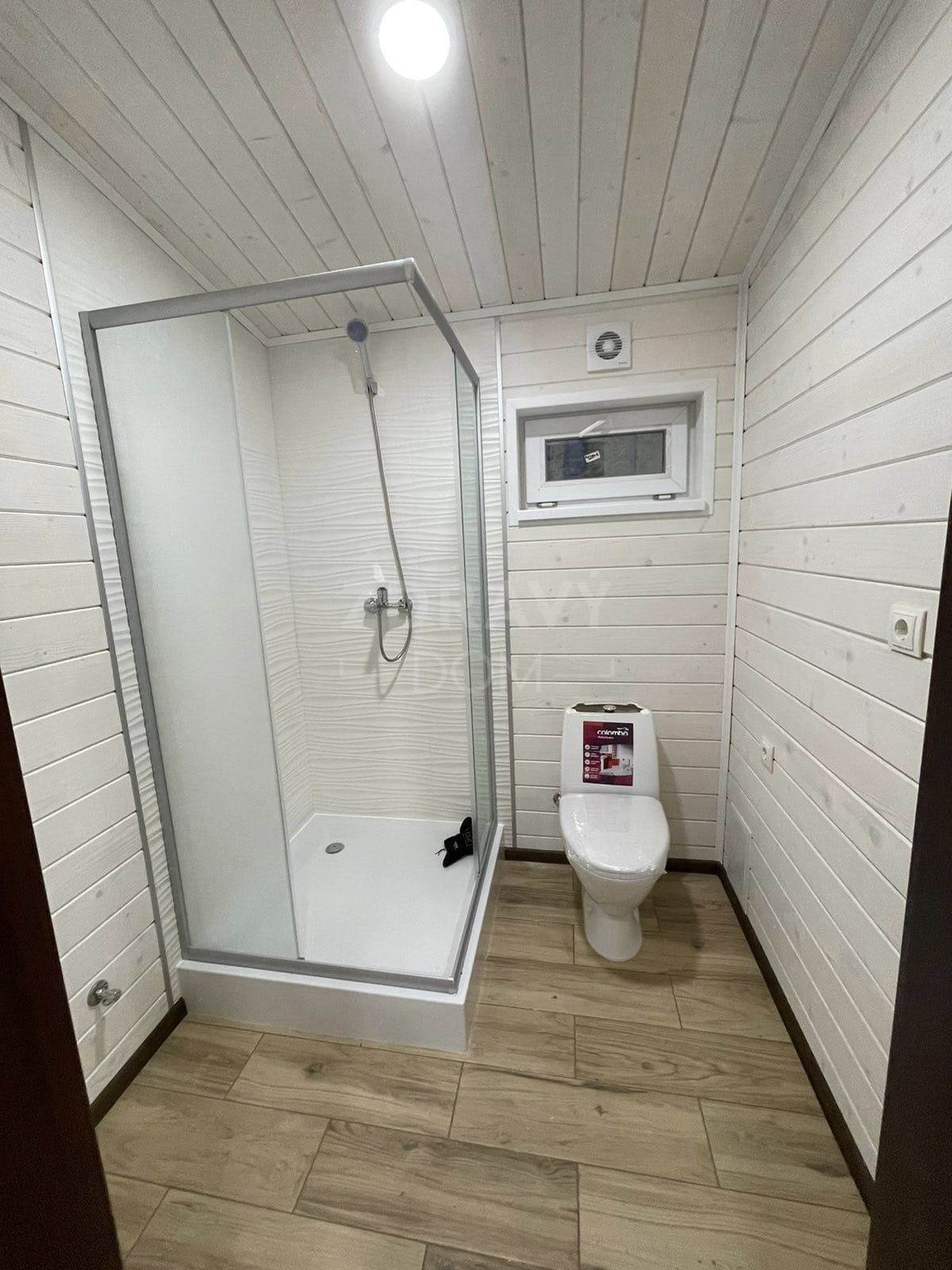 | Dokončovanie stien v kúpeľni | prírodné drevené panely (8,5 cm) a kachličky v sprchovacom kúte |
